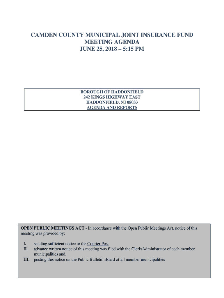 CAMDEN COUNTY MUNICIPAL JOINT INSURANCE FUND MEETING AGENDA JUNE 25, 2018 5:15 BOROUGH OF HADDONFIELD 242 KINGS HIGHWAY EAST HADDONFIELD, NJ 08033 AGENDA AND REPORTSOPEN PUBLIC MEETINGS ACT In accordance