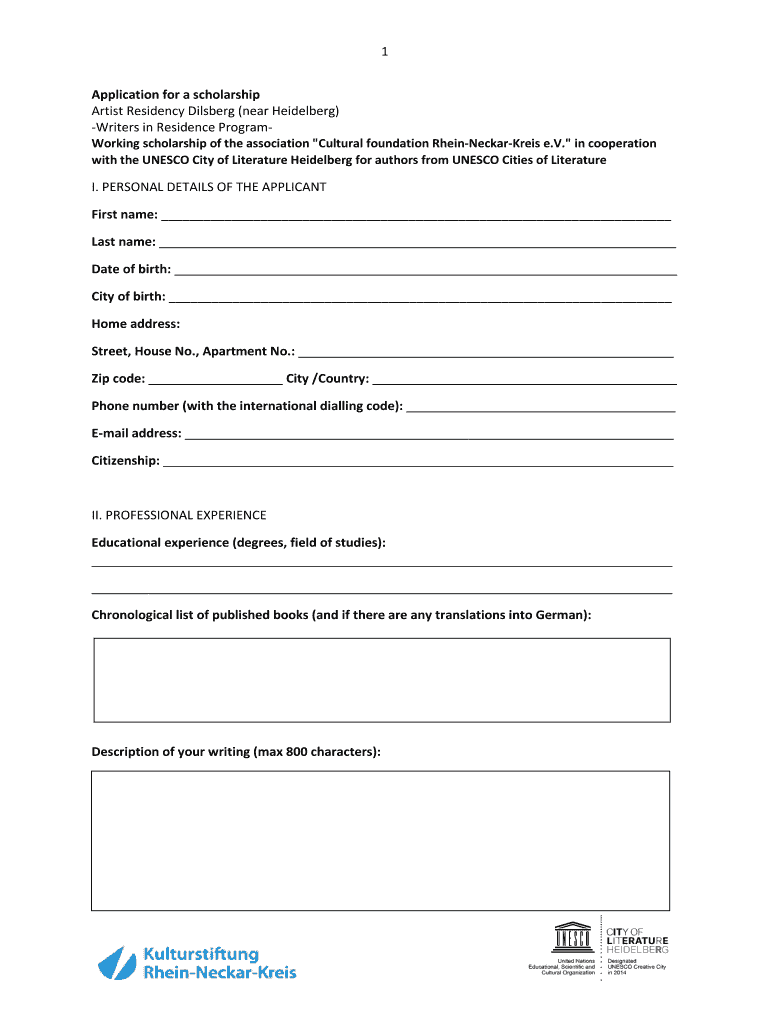 1 Application for a scholarship Artist Residency Ginsberg (near Heidelberg) Writers in Residence ProgramWorking scholarship of the association “Cultural foundation RheinNeckarKreis e.V. in cooperation
