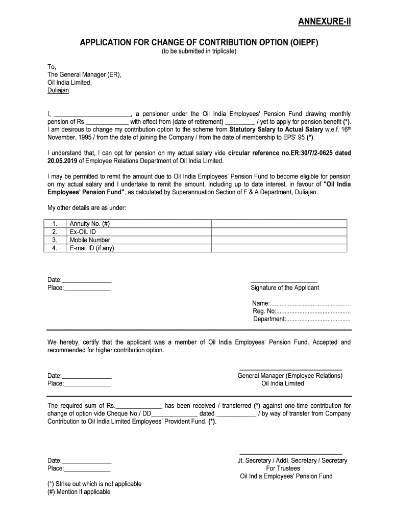 ANNEXUREII APPLICATION FOR CHANGE OF CONTRIBUTION OPTION (OI EPF) (to be submitted in triplicate)To, The General Manager (ER), Oil India Limited, Culiacán. I, a pensioner under the Oil India Employees