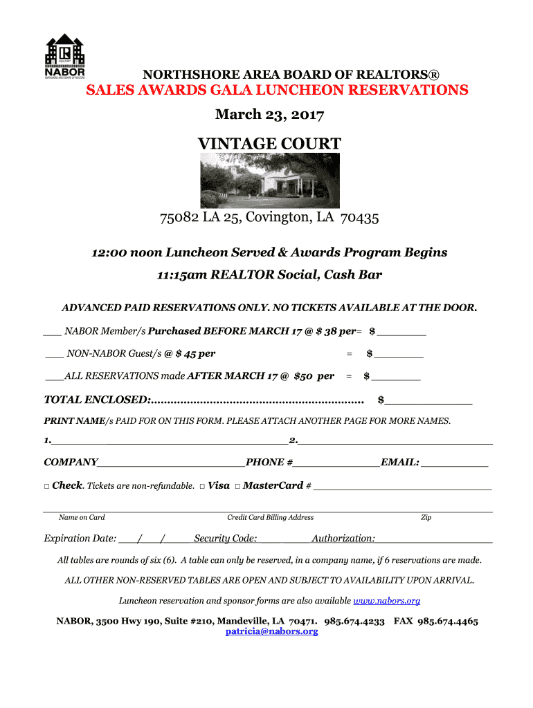 FORESHORE AREA BOARD OF REALTORSSALES AWARDS GALA LUNCHEON RESERVATIONS March 23, 2017VINTAGE COURT75082 LA 25, Covington, LA 70435 12:00 noon Luncheon Served & Awards Program Begins 11:15am REALTOR