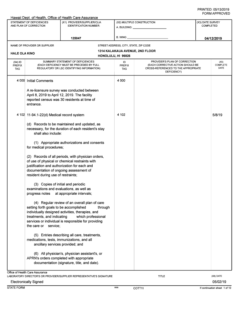 PRINTED: 05/13/2019 FORM APPROVED Hawaii Dept. of Health, Office of Health Care Assurance STATEMENT OF DEFICIENCIES AND PLAN OF CORRECTION(X1) PROVIDER/SUPPLIER/CIA IDENTIFICATION NUMBER:(X3) DATE