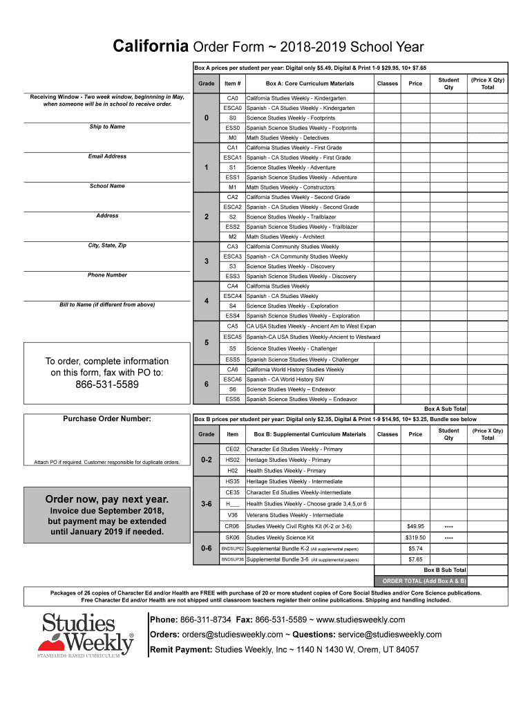 California Order Form 20182019 School Year Box A prices per student per year: Digital only $5.49, Digital & Print 19 ×29.95, 10+ $7.65 Grade Receiving Window Two week window, beginning in May, when