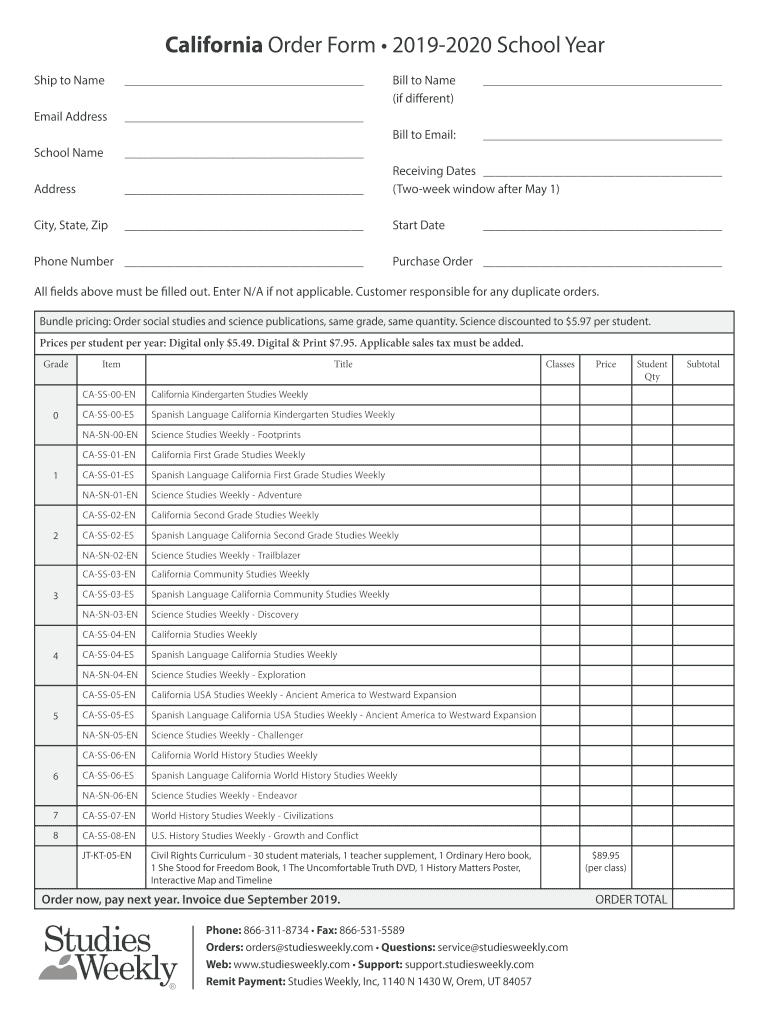 California Order Form 20192020 School Year Ship to Name Email Address School Name Bill to Name(if different) Bill to Email: Address Receiving Dates (Two week window after May 1)City, State, Zip Start