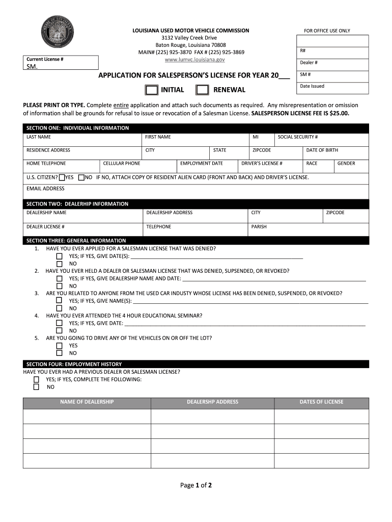 LOUISIANA USED MOTOR VEHICLE COMMISSION 3132 Valley Creek Drive Baton Rouge, Louisiana 70808 MAIN# (225) 9253870 FAX # (225) 9253869 www.lumvc.louisiana.govCurrent License #FOR OFFICE USE ONLY# Dealer