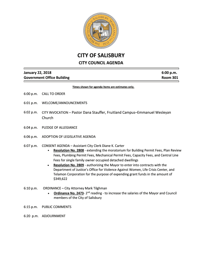 CITYOFSALISBURY CITYCOUNCILAGENDA January22,2018 GovernmentOfficeBuilding 6:00p.m. Room301Timesshownforagendaitemsareestimatesonly.6:00p.m. 6:01p.m. 6:02p.m. 6:04p.m. 6:06p.m. 6:07p.m. 6:10p.m. 6:15p.m.