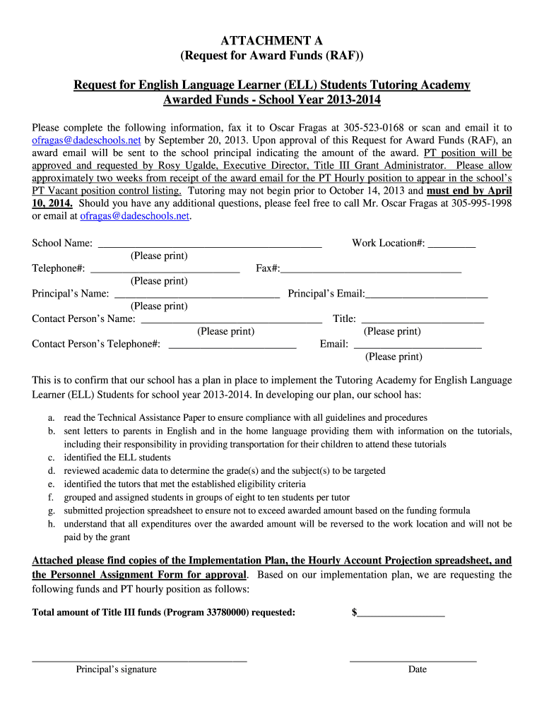 ATTACHMENT A (Request for Award Funds (RAF)) Request for English Language Learner (ELL) Students Tutoring Academy Awarded Funds School Year 20132014 Please complete the following information, fax