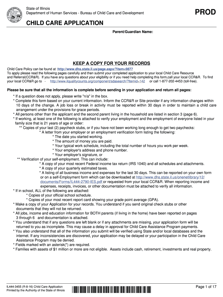 State of Illinois Department of Human Services Bureau of Child Care and DevelopmentPRODCHILD CARE APPLICATION Parent/Guardian Name:KEEP A COPY FOR YOUR RECORDS Child Care Policy can be found at :http://www.dhs.state.il.us/page.aspx/?item9877