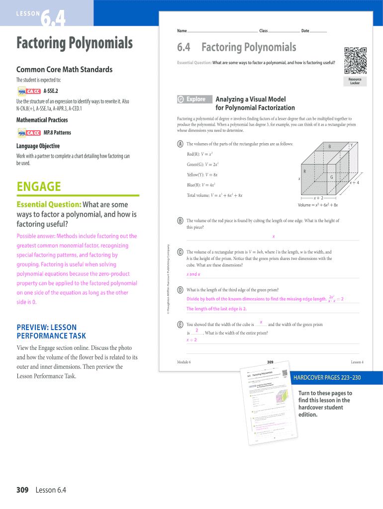 LESSON6.4NameFactoring PolynomialsClass6.4DateFactoring PolynomialsEssential Question: What are some ways to factor a polynomial, and how is factoring useful? Common Core Math Standards