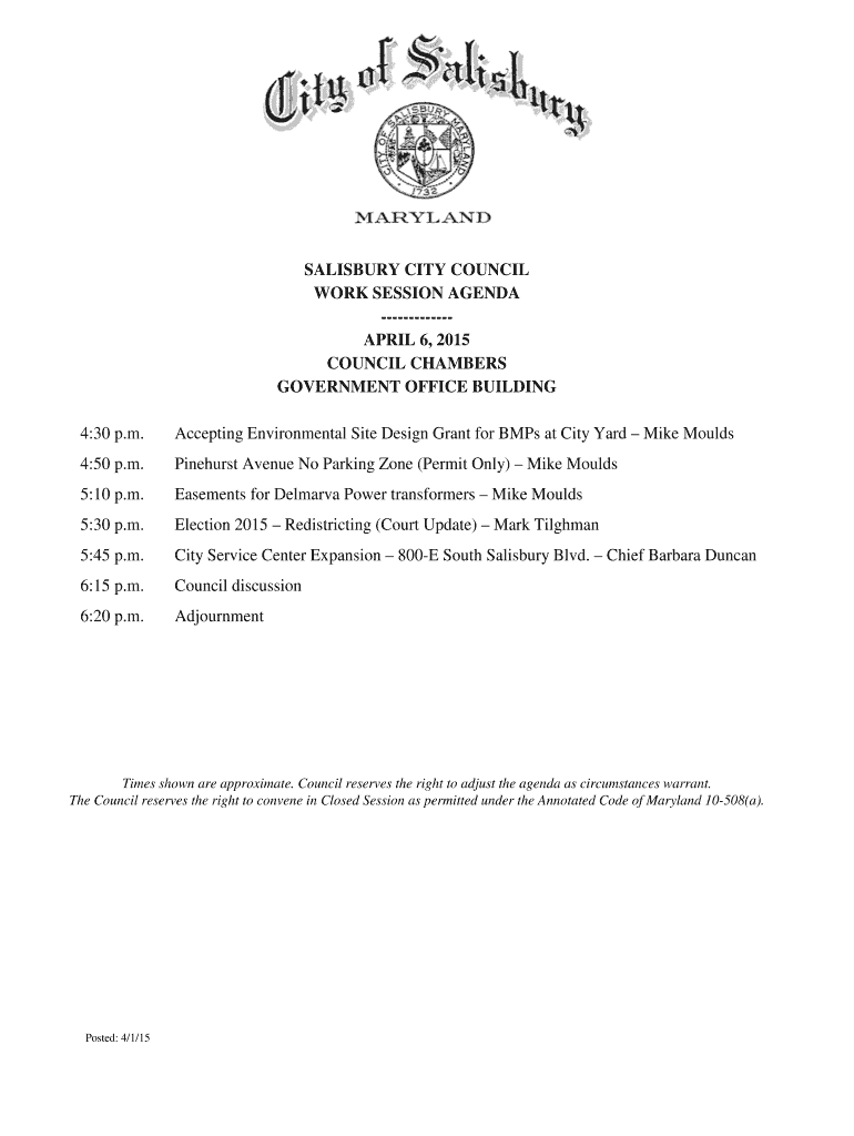 SALISBURY CITY COUNCIL WORK SESSION AGENDA APRIL 6, 2015, COUNCIL CHAMBERS GOVERNMENT OFFICE BUILDING 4:30 p.m. Accepting Environmental Site Design Grant for BMP sat City Yard Mike Moulds4:50 p.m.