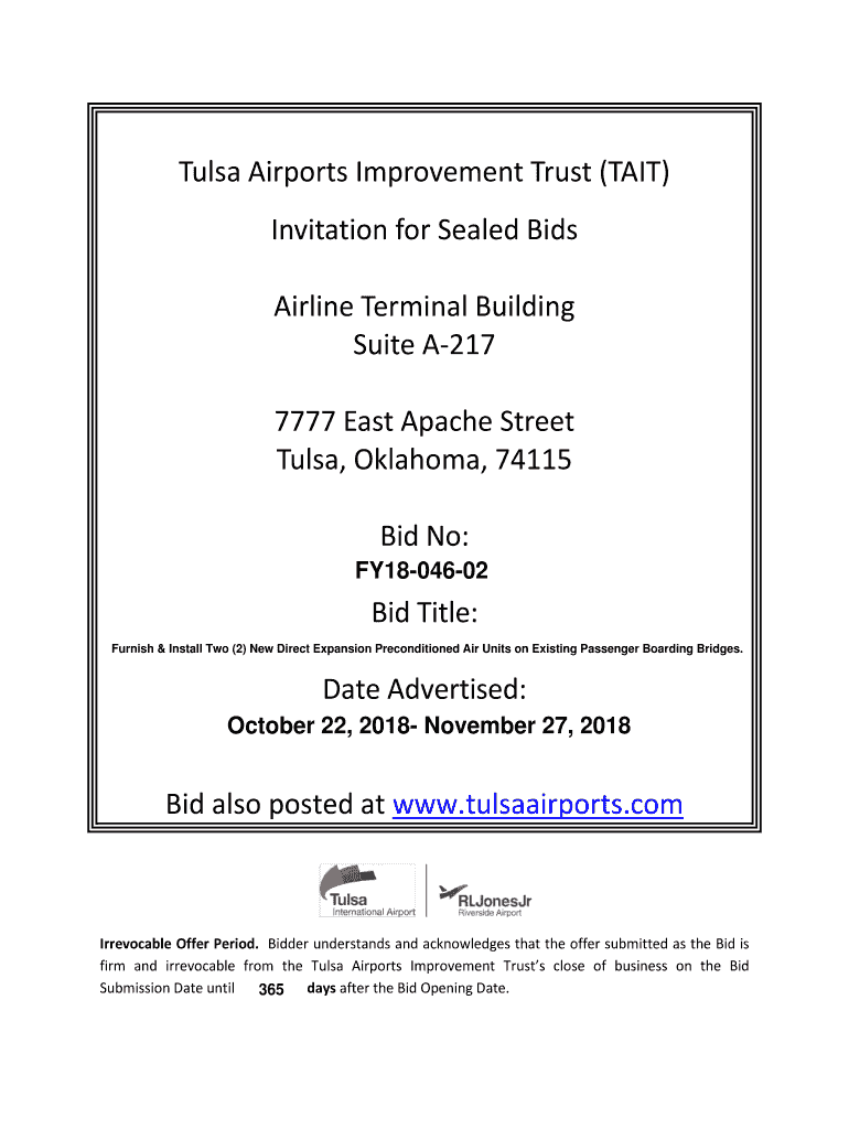 Tulsa Airports Improvement Trust (WAIT) Invitation for Sealed Bids Airline Terminal Building Suite A217 7777 East Apache Street Tulsa, Oklahoma, 74115 Bid No: FY1804602Bid Title: Furnish & Install