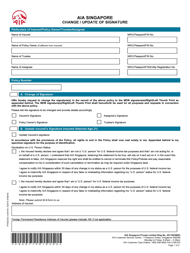 SINGAPORECHANGE / UPDATE OF SIGNATURE Particulars of Insured/Policy Owner/Trustee/Assignee Name of InsuredNRIC/Passport/FIN No. Name of Policy Owner (if different from Insured)ERIC/Passport/FIN No.