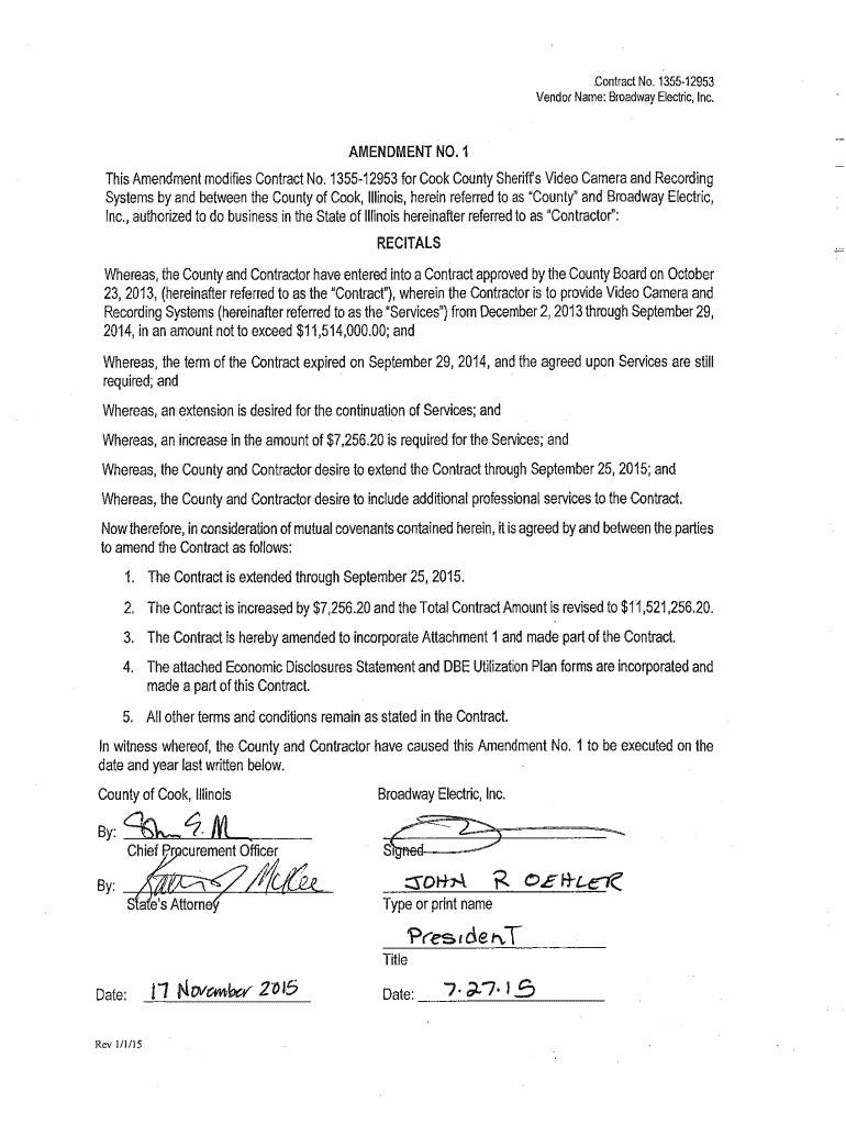 Contract No. 135512953 Vendor Name: Broadway Elect DC, Inc. AMENDMENT NO. 1 modifies Contract No. 135512953 for Cook County Sheriffs Video Camera and Recording and between the County of Cook, Illinois,