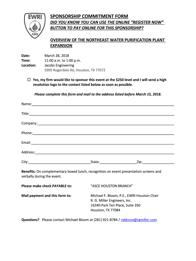 SPONSORSHIPCOMMITMENTFORM DIDYOUKNOWYOUCANUSETHEONLINEREGISTERNOW BUTTONTOPAYONLINEFORTHISSPONSORSHIP? OVERVIEWOFTHENORTHEASTWATERPURIFICATIONPLANT EXPANSION Date: Time: Location:March28,2018 11:00a.m.to1:00p.m.