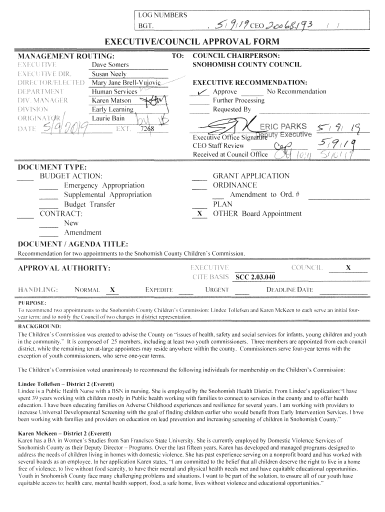 EXECUTIVE/COUNCIL APPROVAL FORM TO:MANAGEMENT Relating:COUNCIL CHAIRPERSON: SNOHOMISH COUNTY COUNCIL EXECUTIVE RECOMMENDATION: Approve No Recommendation Further Processing Requested Document TYPE: