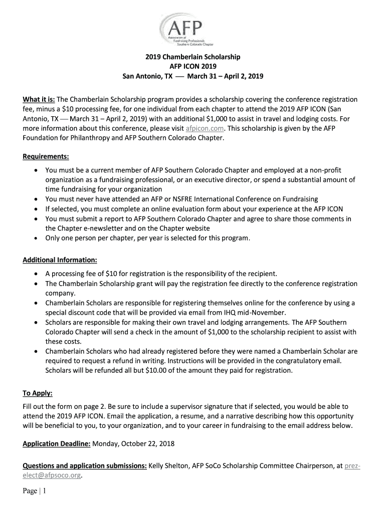 2019 Chamberlain Scholarship AFP ICON 2019 San Antonio, TX March 31 April 2, 2019, What it is: The Chamberlain Scholarship program provides a scholarship covering the conference registration fee,