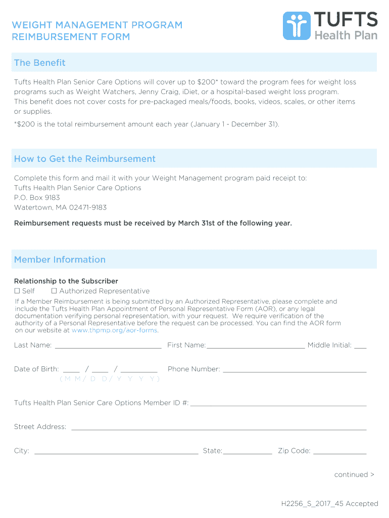 WEIGHT MANAGEMENT PROGRAM REIMBURSEMENT FORM The Benefit Tufts Health Plan Senior Care Options will cover up to $200* toward the program fees for weight loss programs such as Weight Watchers, Jenny