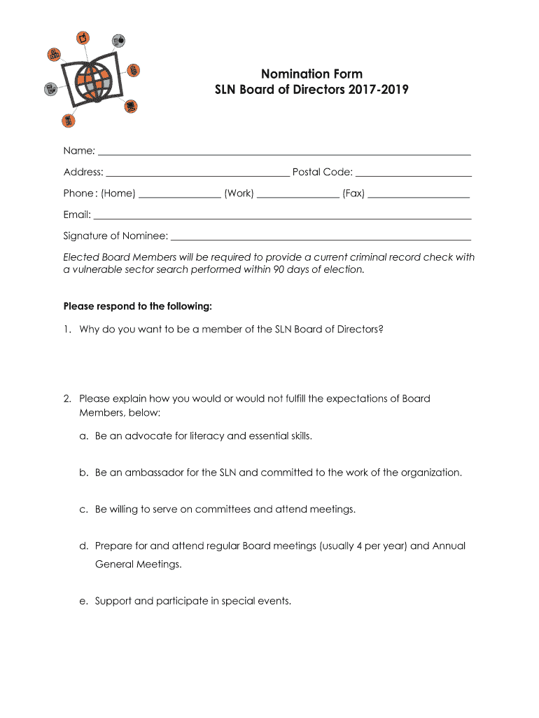 Nomination Form SLN Board of Directors 20172019Name: Address: Postal Code: Phone : (Home) (Work) (Fax) Email: Signature of Nominee: Elected Board Members will be required to provide a current criminal