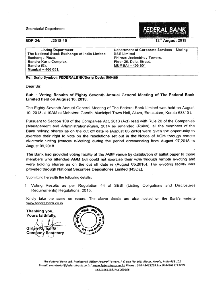 FEDERAL BANISecretarial DepartmentYOUR Pf! W;CT BANKING PARTNERSDF24/Listing Department! The National Stock Exchange of India Limited: Exchange Plaza, BandraKurla Complex, Sandra E, Mumbai 400 051.