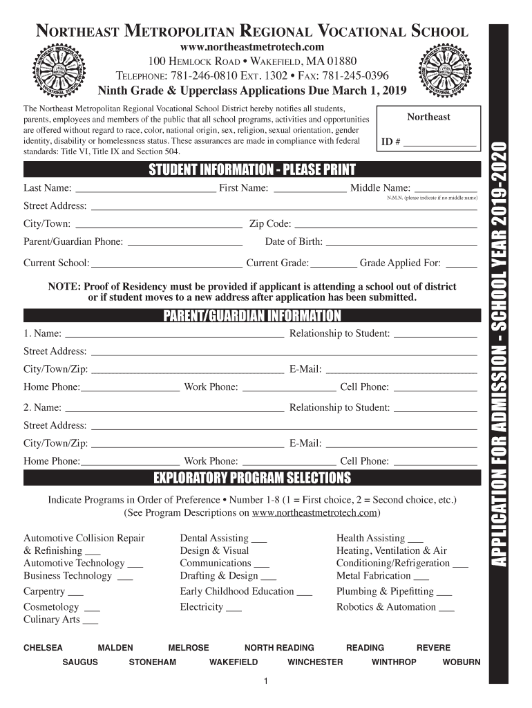 Northeast Metropolitan Regional Vocational School www.northeastmetrotech.com 100 Hemlock Road Wakefield, MA 01880 Telephone: 7812460810 Ext. 1302 Fax: 7812450396Ninth Grade & Upper class Applications