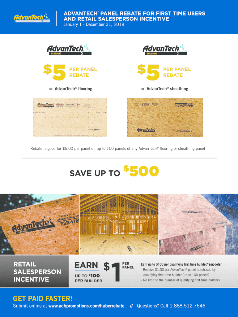 ADVANCE PANEL REBATE FOR FIRST TIME USERS AND RETAIL SALESPERSON INCENTIVE January 1 December 31, 2019×$5PER PANEL REBATE on Advance flooring5PER PANEL REBATE on Advance sheathingRebate is good for