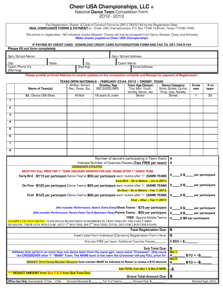 Cheer USA Championships, LLC National Dance Team Competition Form 2012 2013 Fax Registration, Roster, & Code of Conduct Forms to (281) 7645144 by the Registration Date. MAIL COMPLIANCE FORMS & PAYMENT
