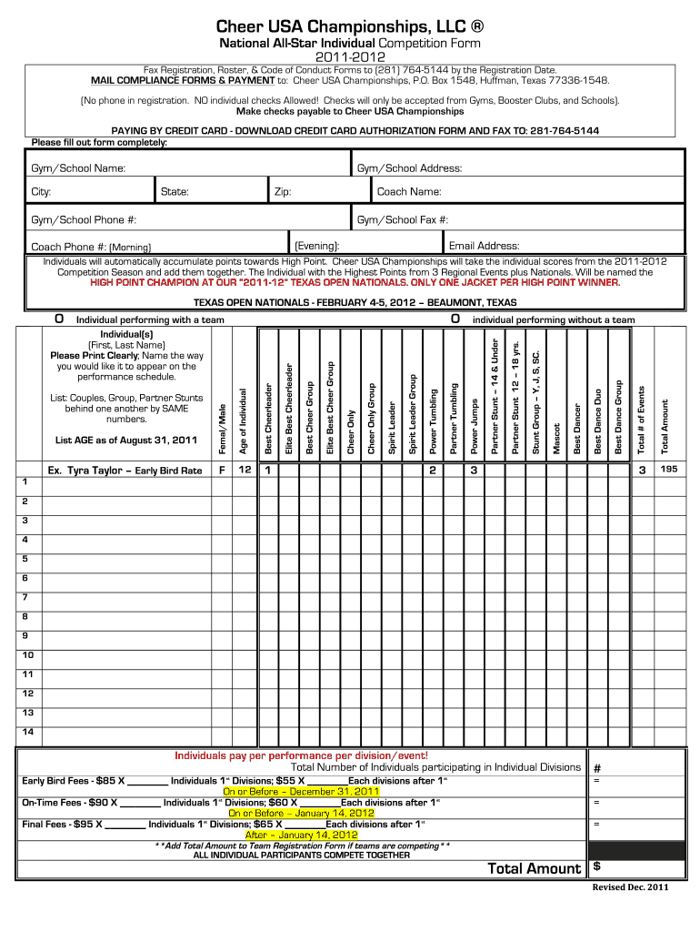 Cheer USA Championships, LLC National Altar Individual Competition Form 20112012 Fax Registration, Roster, & Code of Conduct Forms to (281) 7645144 by the Registration Date. MAIL COMPLIANCE FORMS