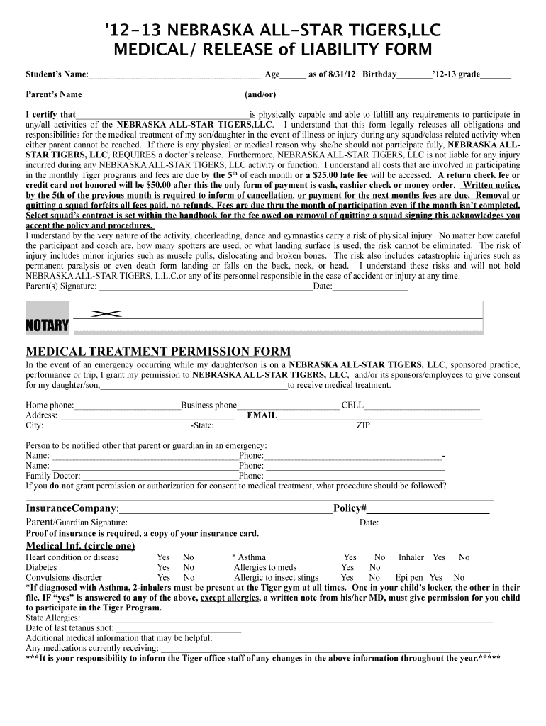 1213 NEBRASKA ALL STAR TIGERS, LLC MEDICAL/ RELEASE of LIABILITY FORM Students Name: Age as of 8/31/12 Birthday 1213 grade Parents Name (and/or) I certify that is physically capable and able to fulfill