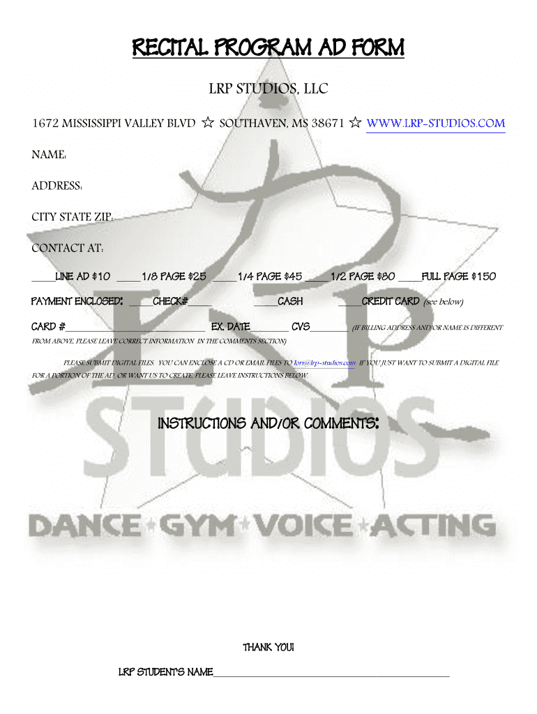 RECITAL PROGRAM AD FORM LRP STUDIOS, LLC 1672 MISSISSIPPI VALLEY BLVDSOUTHAVEN, MS 38671WWW.STUDIOS.COMPARE: ADDRESS: CITY STATE ZIP: CONTACT AT: LINE AD $10 1/8 PAGE $25 1/4 PAGE $45 1/2 PAGE $80
