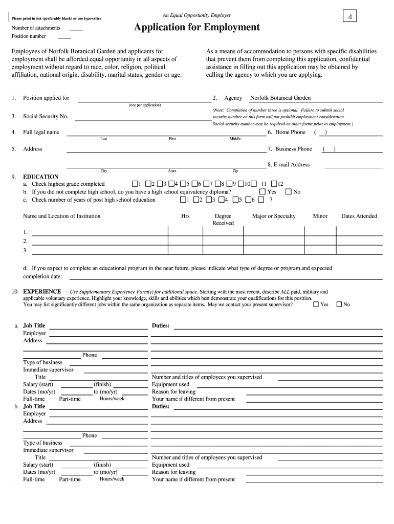 An Equal Opportunity EmployerPlease print in ink (preferably black) or use typewriter4Application for EmploymentNumber of attachments