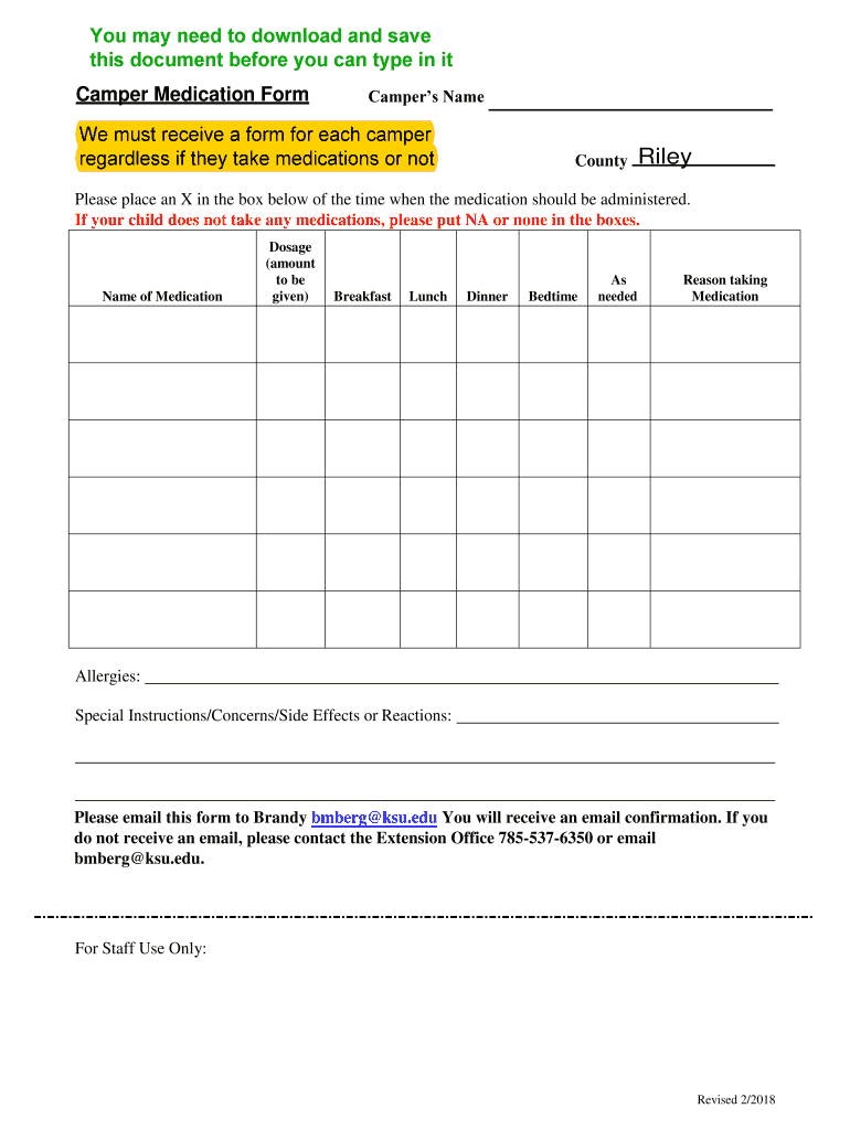 Camper Medication Forecasters Name must receive a form for each camper