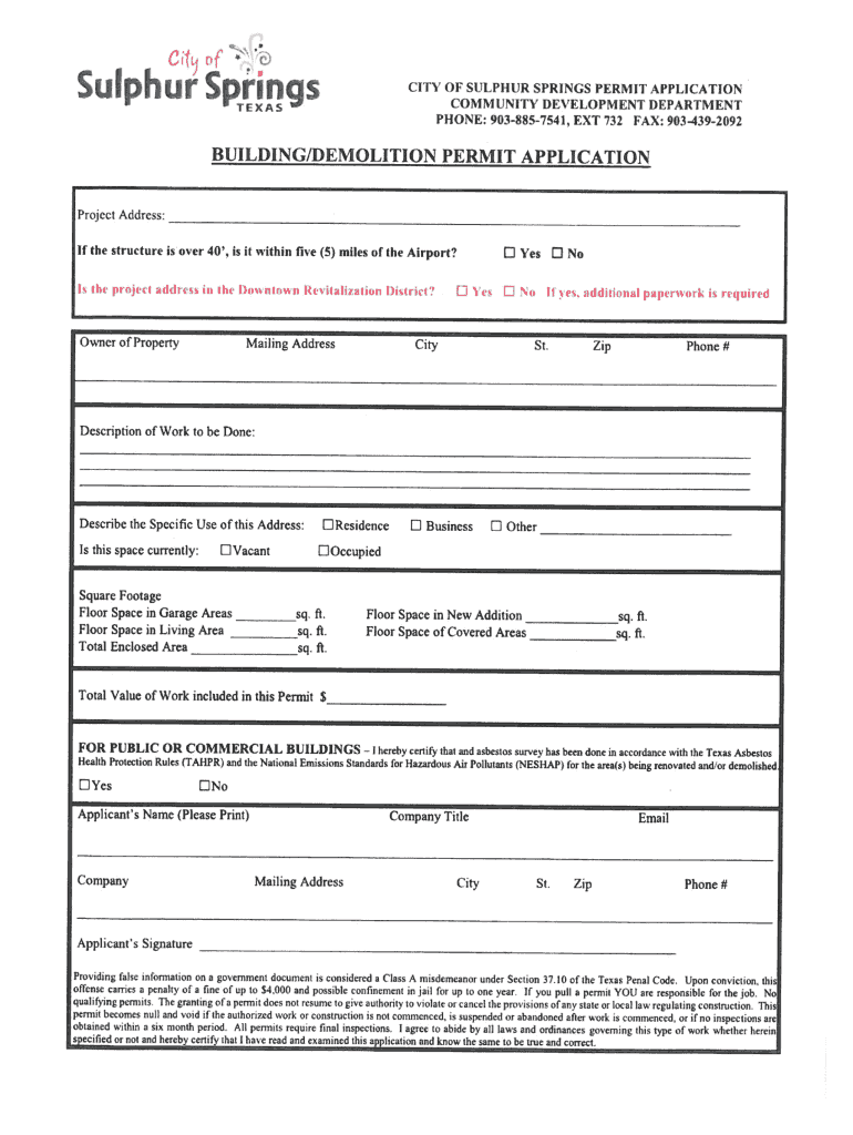 R 1’s. Ci of 'sulfur Springily OF Sulfur SPRINGS PERMIT APPLICATION COMMUNITY DEVELOPMENTDEPARTMENT PHONE: 9038857541, EXT 732 FAX: 903 392092TEXASBUILDING/DEMOLITION PERMIT APPLICATIONProject Address:If