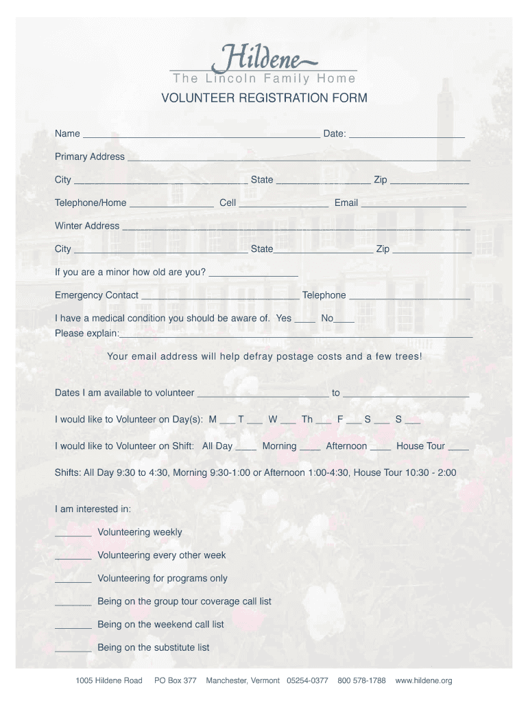 Get the free The Lincoln Family Home VOLUNTEER REGISTRATION FORM - hildene.org