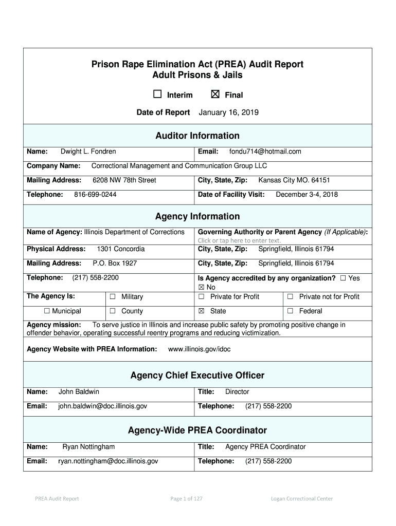 Prison Rape Elimination Act (AREA) Audit Report Adult Prisons & JailsInterimDate of ReportFinalJanuary 16, 2019Auditor Information Name:Dwight L. FondrenEmail:fondu714 Hotmail. Company Name:Correctional
