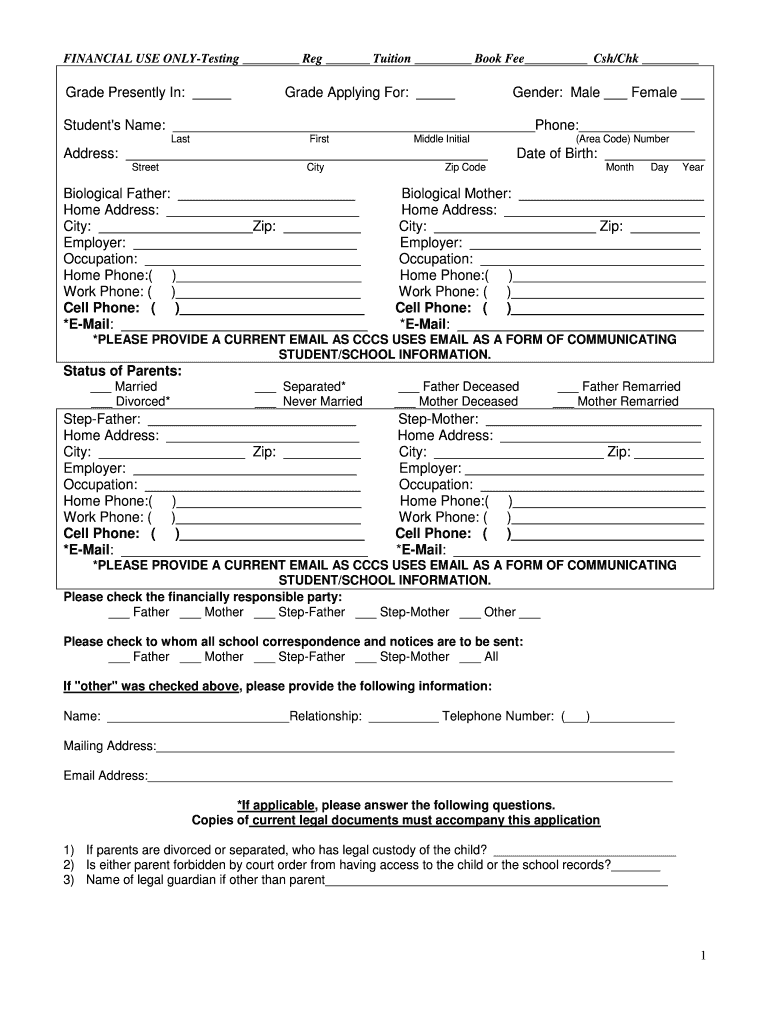 FINANCIAL USE Contesting Reg Tuition Book Fee CSH/CHK Grade Presently In: Grade Applying For: Gender: Male Female Student's Name: Phone: LastFirstMiddle InitialAddress: StreetCityBiological Father: