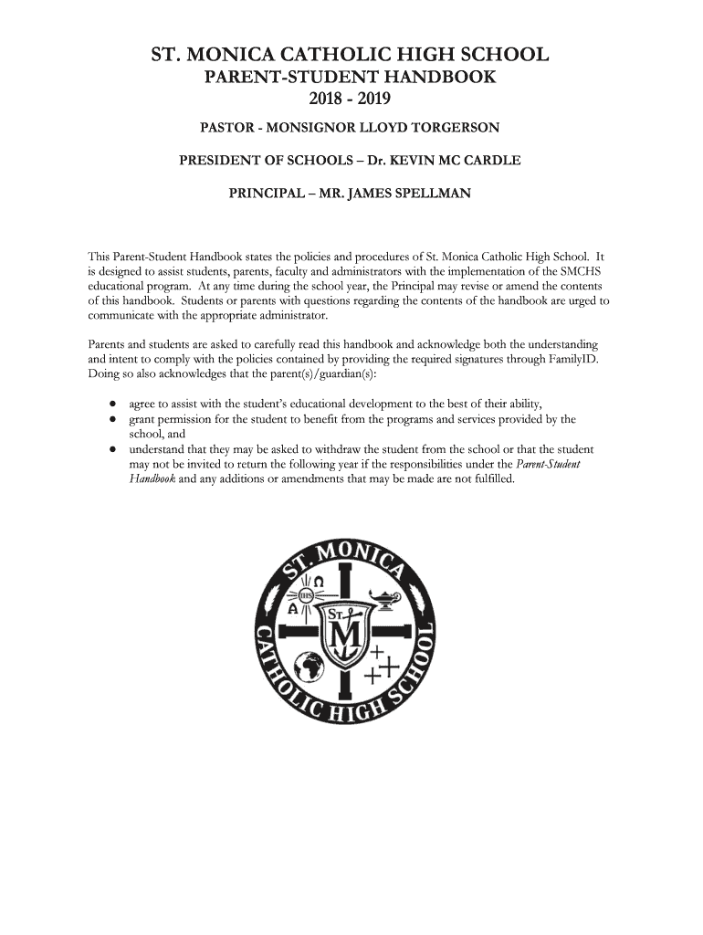 ST. MONICA CATHOLIC HIGH SCHOOL PARENTSTUDENT HANDBOOK 2018 2019 PASTOR MONSIGNOR LLOYD JORGENSON PRESIDENT OF SCHOOLS Dr. KEVIN MC CANDLE PRINCIPAL MR. JAMES Stellantis ParentStudent Handbook states