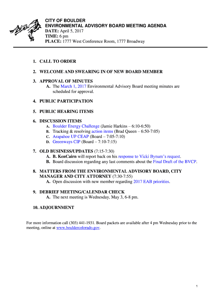 CITY OF BOULDER ENVIRONMENTAL ADVISORY BOARD MEETING AGENDA DATE: April 5, 2017, TIME: 6 pm PLACE: 1777 West Conference Room, 1777 Broadway1. CALL TO ORDER 2. WELCOME AND SWEARING IN OF NEW BOARD