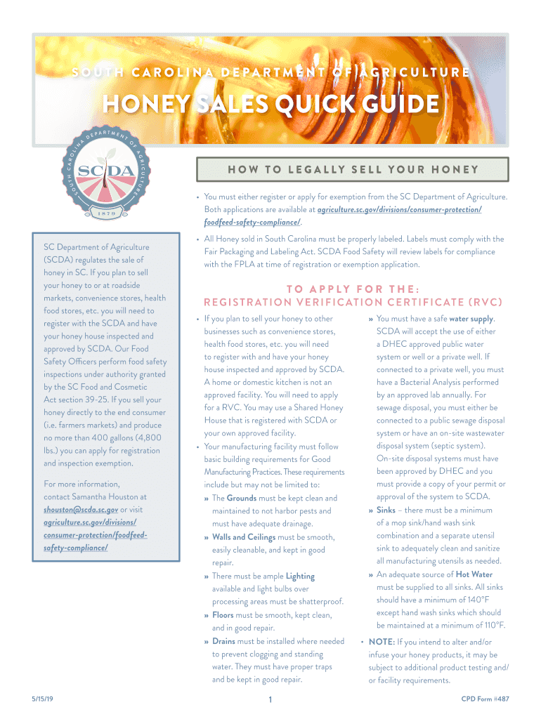 SOUTH CAROLINA DEPARTMENT OF AGRICULTUREHONEY SALES QUICK GUIDE HOW TO LEGALLY SELL YOUR HONEY You must either register or apply for exemption from the SC Department of Agriculture. Both applications