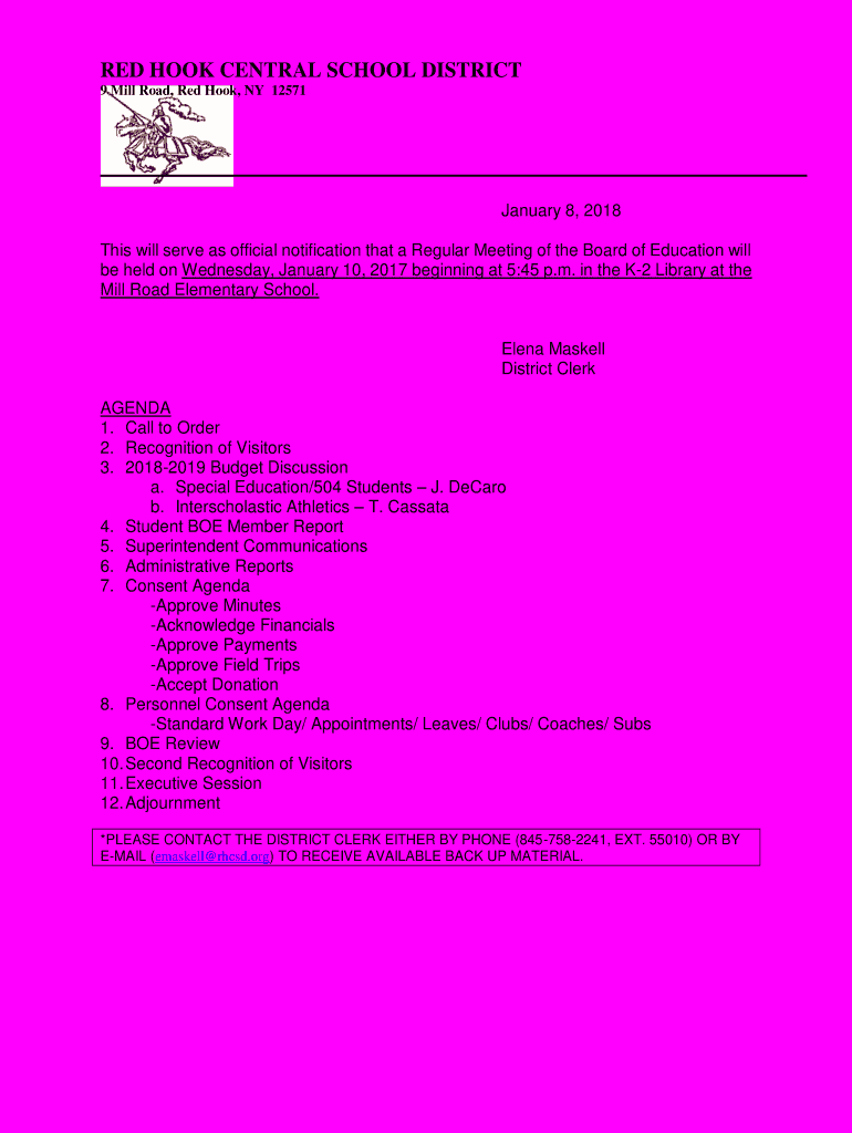 RED HOOK CENTRAL SCHOOL DISTRICT 9 Mill Road, Red Hook, NY 12571January 8, 2018 This will serve as official notification that a Regular Meeting of the Board of Education will be held on Wednesday,