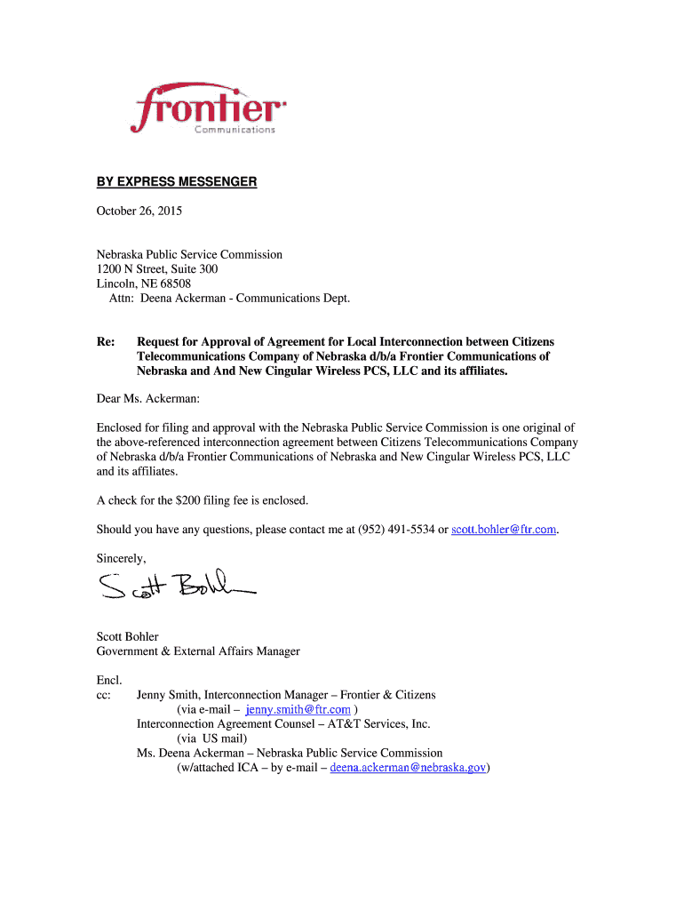 BY EXPRESS MESSENGER October 26, 2015Nebraska Public Service Commission 1200 N Street, Suite 300 Lincoln, NE 68508 Attn: Deena Ackerman Communications Dept. Re:Request for Approval of Agreement for