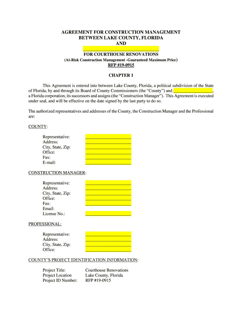 AGREEMENT FOR CONSTRUCTION MANAGEMENT BETWEEN LAKE COUNTY, FLORIDA AND FOR COURTHOUSE RENOVATIONS (Risk Construction Management Guaranteed Maximum Price)RFP #190915 CHAPTER 1 This Agreement is entered