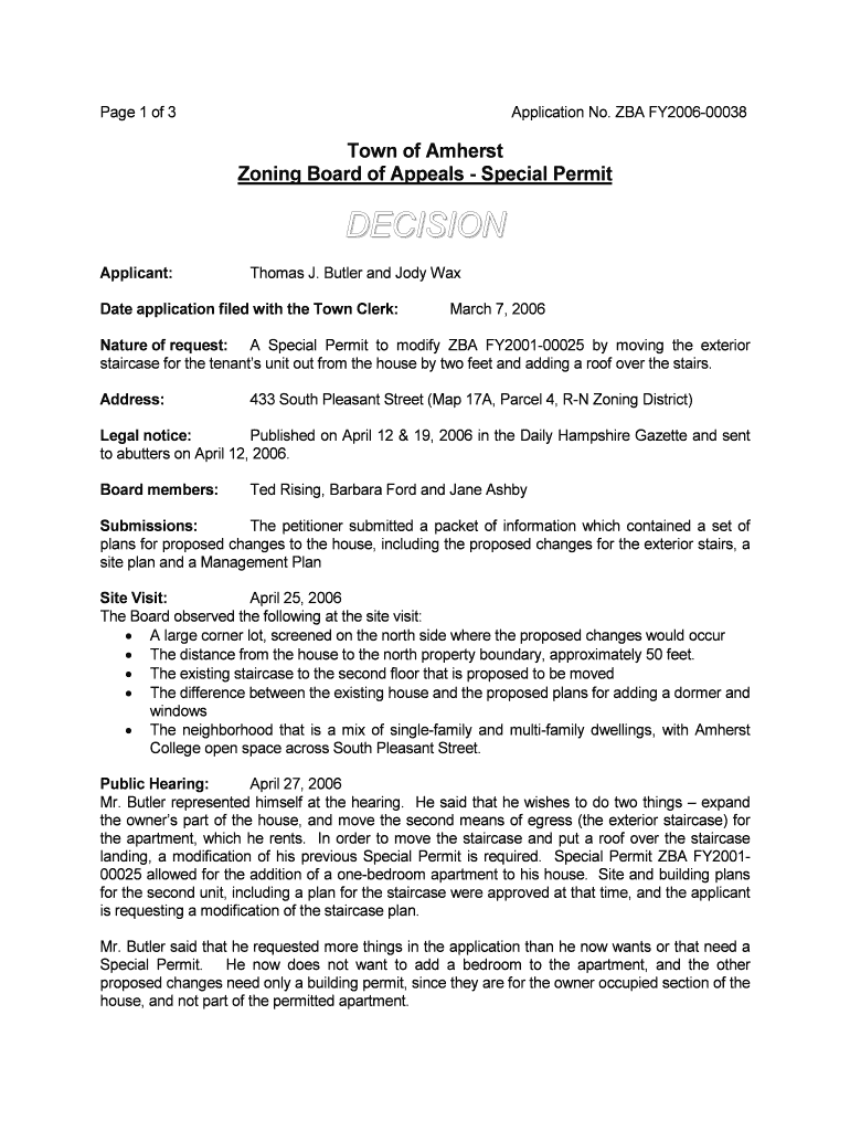 Page 1 of 3Application No. CBA FY200600038Town of Amherst Zoning Board of Appeals Special PermitDECISION Applicant:Thomas J. Butler and Jody Mandate application filed with the Town Clerk:March 7,
