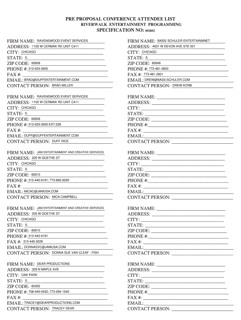 PRE PROPOSAL CONFERENCE ATTENDEE LISTRIVERWALK ENTERTAINMENT PROGRAMMINGSPECIFICATION NO: 092892 RAVENSWOOD EVENT SERVICES FIRM NAME: 1100 W CERMAV RD UNIT C411 ADDRESS: CHICAGO CITY: IL STATE: 60608