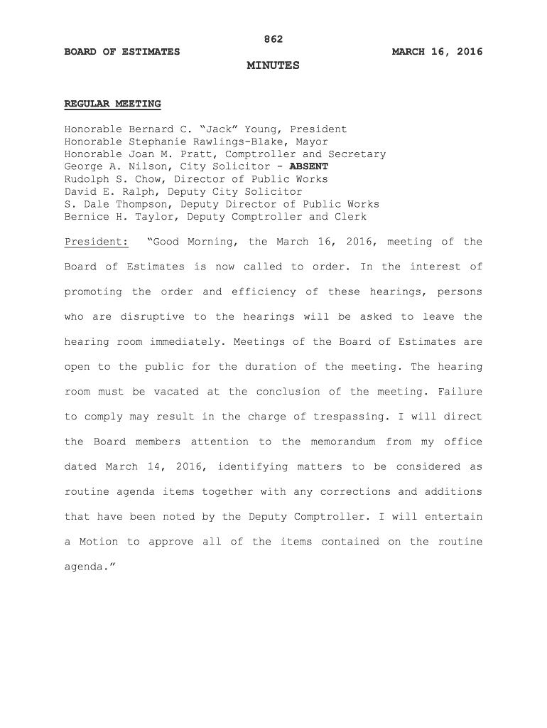 862 BOARD OF ESTIMATESMARCH 16, 2016MINUTES REGULAR MEETING Honorable Bernard C. Jack Young, President Honorable Stephanie RawlingsBlake, Mayor Honorable Joan M. Pratt, Comptroller and Secretary George