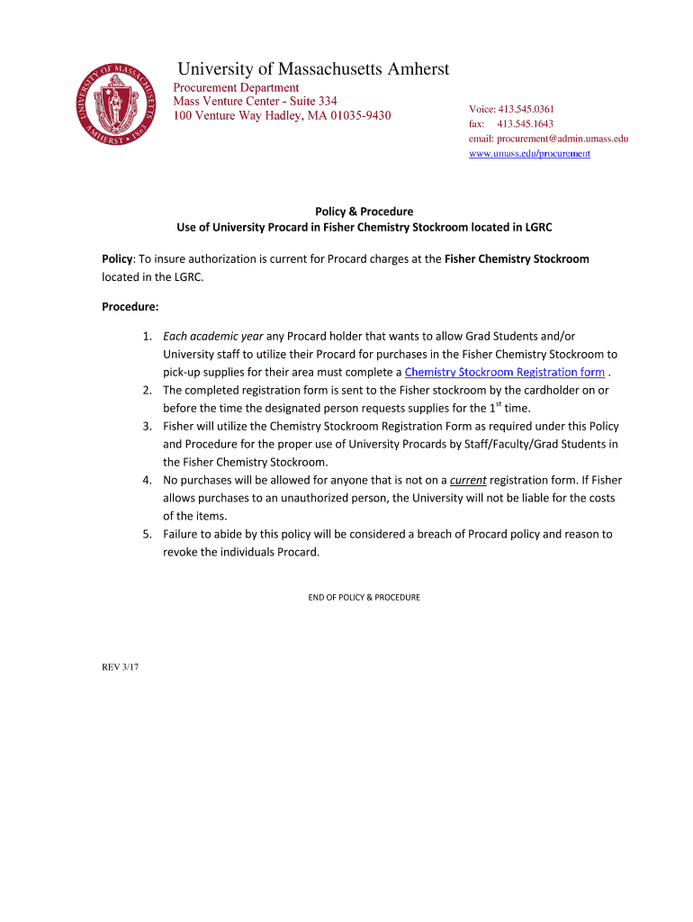 Get the free Fisher Stockroom Policy & Procedures - UMass Amherst