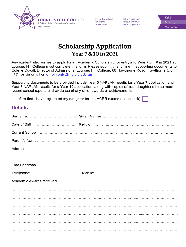 86 Hawthorne Road Hawthorne Queensland 4171Tel: (07) 3399 8888 Fax: (07) 3899 1007 www.lhc.qld.edu.auScholarship Application Year 7 & 10 in 2021 Any student who wishes to apply for an Academic Scholarship