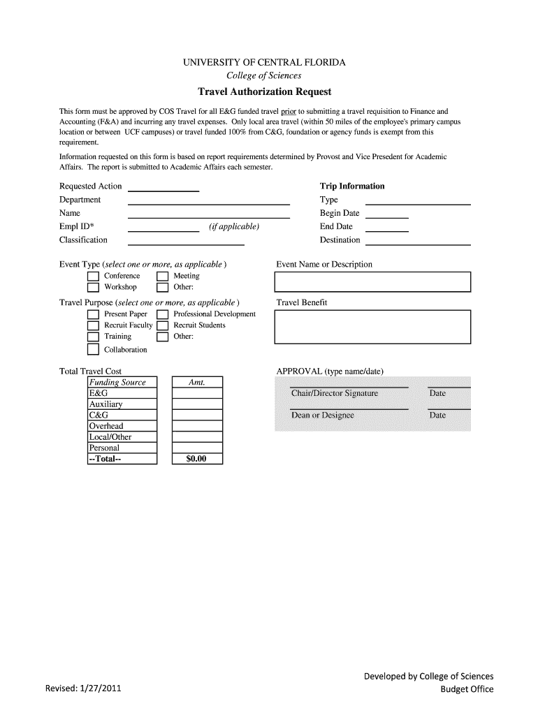 UNIVERSITY OF CENTRAL FLORIDA College of SciencesTravel Authorization Request This form must be approved by COS Travel for all E&G funded travel prior to submitting a travel requisition to Finance