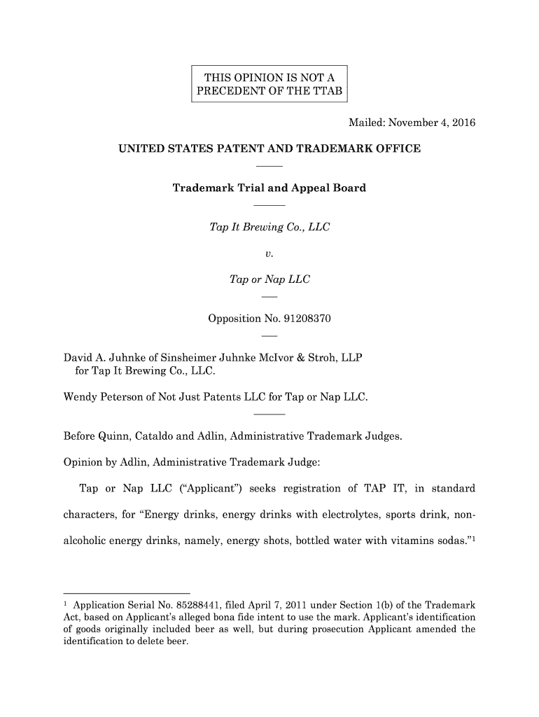 THIS OPINION IS NOT A PRECEDENT OF THE STAB Mailed: November 4, 2016, UNITED STATES PATENT AND TRADEMARK OFFICE Trademark Trial and Appeal Board Tap It Brewing Co., LLC v. Tap or Nap LLC Opposition
