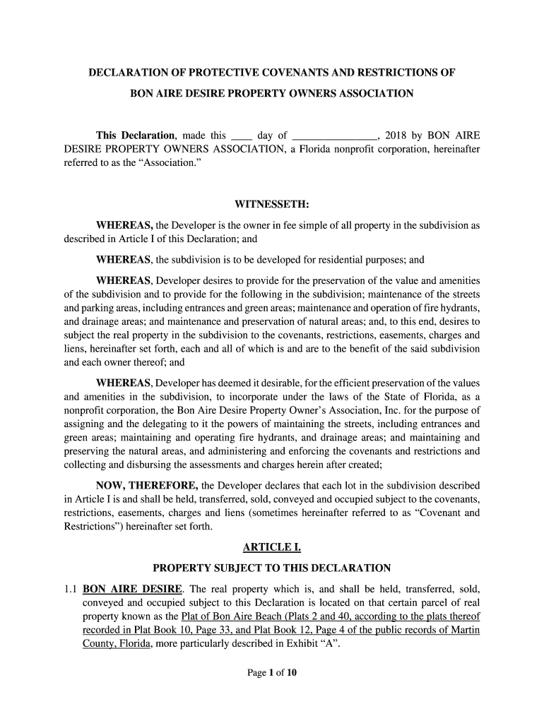 DECLARATION OF PROTECTIVE COVENANTS AND RESTRICTIONS OF ON ARE DESIRE PROPERTY OWNERS Associations Declaration, made this day of, 2018 by ON ARE DESIRE PROPERTY OWNERS ASSOCIATION, a Florida nonprofit