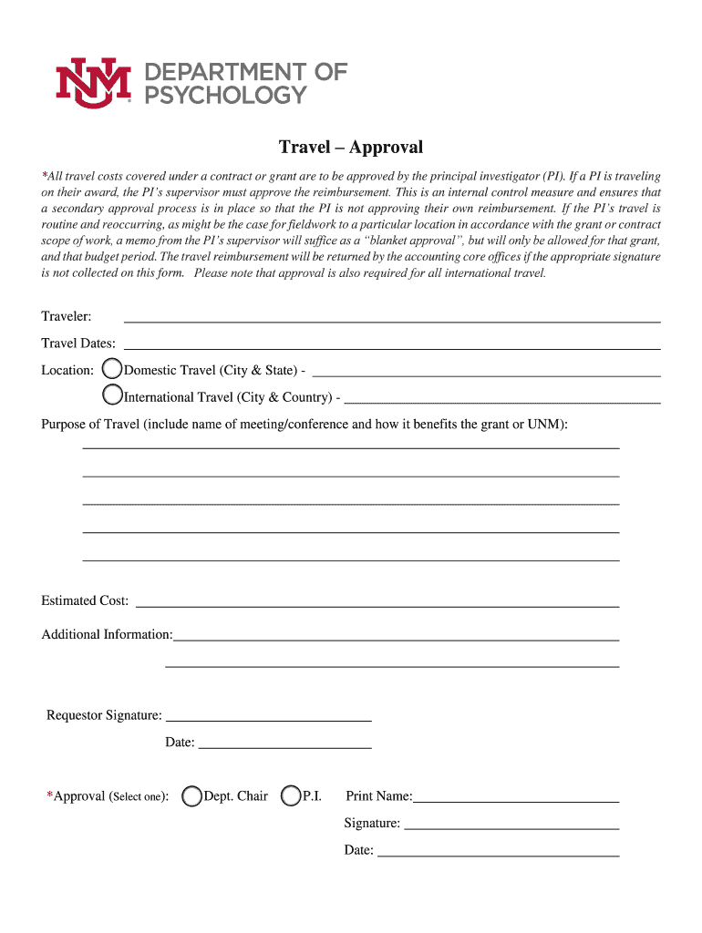 Travel Approval *All travel costs covered under a contract or grant are to be approved by the principal investigator (PI). If a PI is traveling on their award, the PI's supervisor must approve the