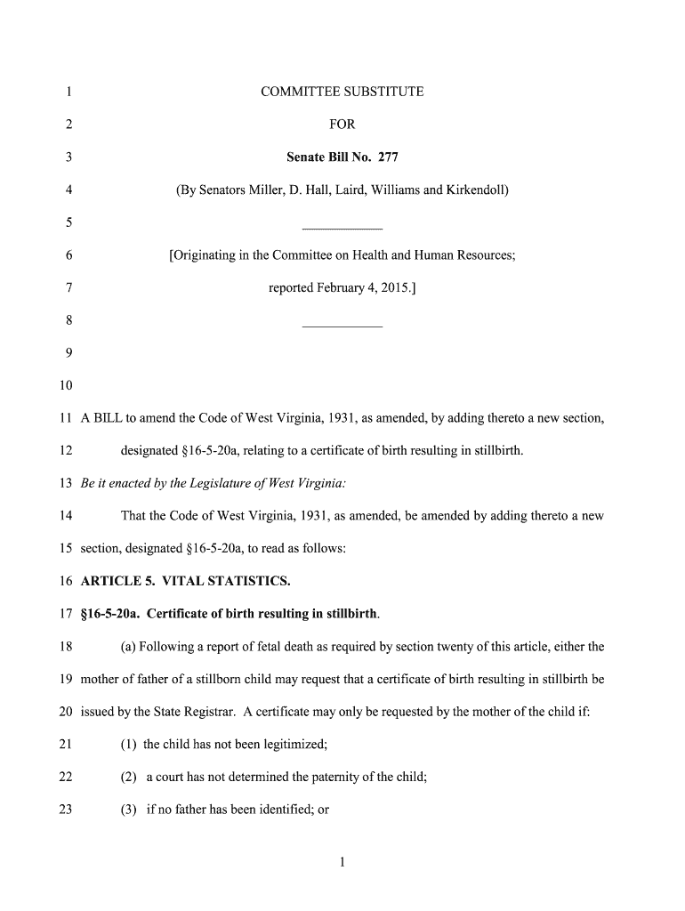 1COMMITTEE SUBSTITUTE2FOR3Senate Bill No. 2774(By Senators Miller, D. Hall, Laird, Williams and Kuykendall)5 6 Originating in the Committee on Health and Human Resources;7reported February 4, 2015.